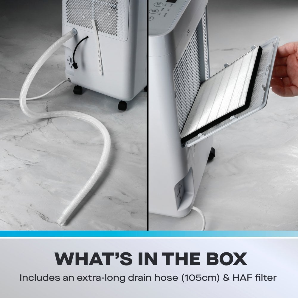 Compact Control for Damp and Air Quality: The Daewoo 12L Dehumidifier with Air Purifier offers an easy and effective way to manage moisture while improving the air you breathe. Designed for bedrooms, home offices or smaller living spaces where damp and allergens are a concern. Smart Functions, Easy Living: With 12L daily moisture removal, this unit supports 4 modes: Dehumidify, Laundry, Silent, and Fan Only. The built-in HAF filter helps trap fine dust and allergens, making it perfect for allergy-prone households or humid conditions. Clear Display, Simple Settings: The digital LED display lets you view real-time humidity and adjust the settings with just a few taps. Choose your target humidity, set a timer, or activate child lock mode for added safety. When the 2L tank is full, the unit shuts off automatically - or connect the included hose for continuous drainage. Lightweight and Ready to Move: Fitted with castors and a compact build, it's easy to wheel this unit from room to room. With a built-in handle and tidy cable strap, storage is just as straightforward when not in use. Built to Last: Register online for a 3-year extended warranty and enjoy ongoing peace of mind. From drying clothes indoors to reducing musty smells or allergy triggers, the Daewoo 12L Dehumidifier is made for everyday life. Find out how to pick the perfect dehumidifier for your space in our handy guide here
